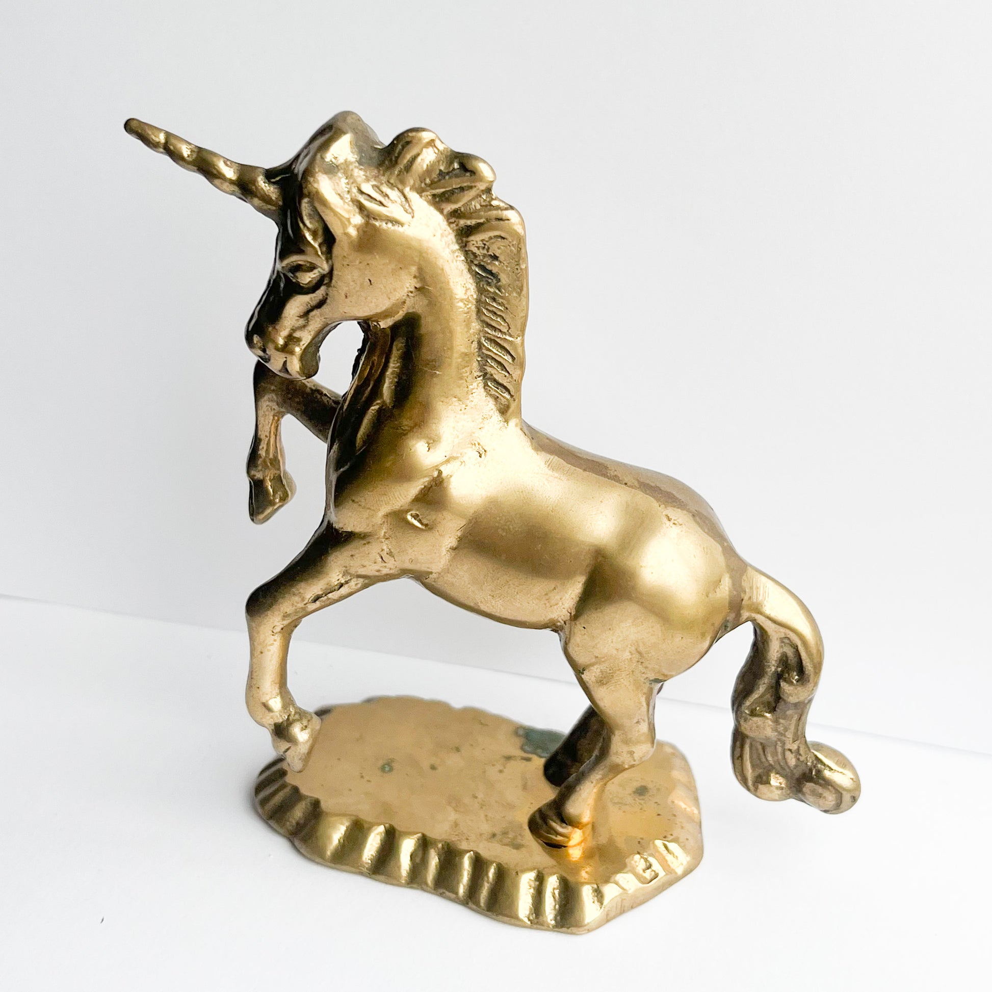 A charming vintage brass unicorn figurine featuring a timeless design, detailed craftsmanship, and a warm, golden patina, perfect for adding a whimsical touch to any space or as a unique collectible.